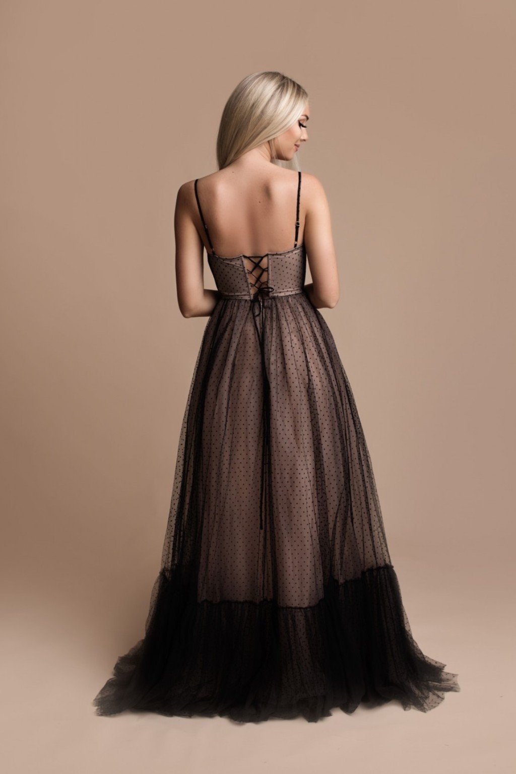 Krásna tylová sukňa zdobená riasením v spodnej časti za sebou tiahne veľkú dávku elegancie. Na spoločenskej udalosti budete nepochybne za noblesnú dámu. Vzadu na chrbte majú viazanie, na prsiach sú vystužené a ramienka sú nastaviteľné.