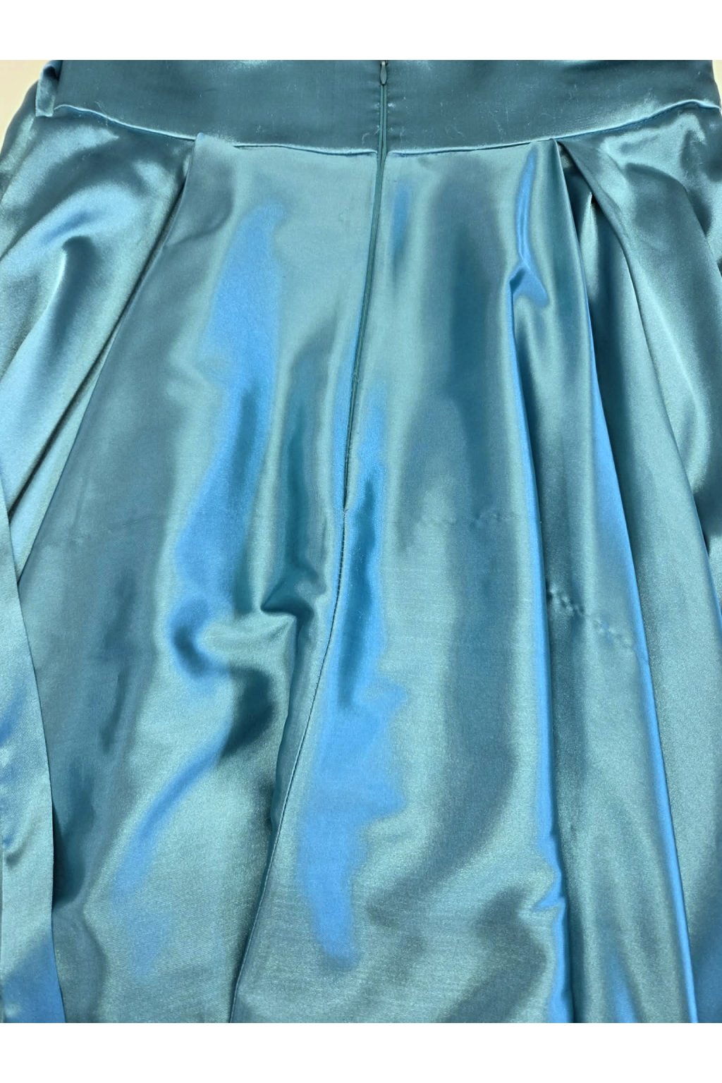 Luxusný outfit a pocit jedinečnosti vám zaručí táto sukňa v okúzľujúcej nezvyčajnej modrozelenej farbe. Tenký ľahučký satén vás pohladí na koži (aj na duši, keď sa uvidíte v sukničke v zrkadle). Stuha v páse, rozparok a vrecká sú už len sladkou bodkou na záver.