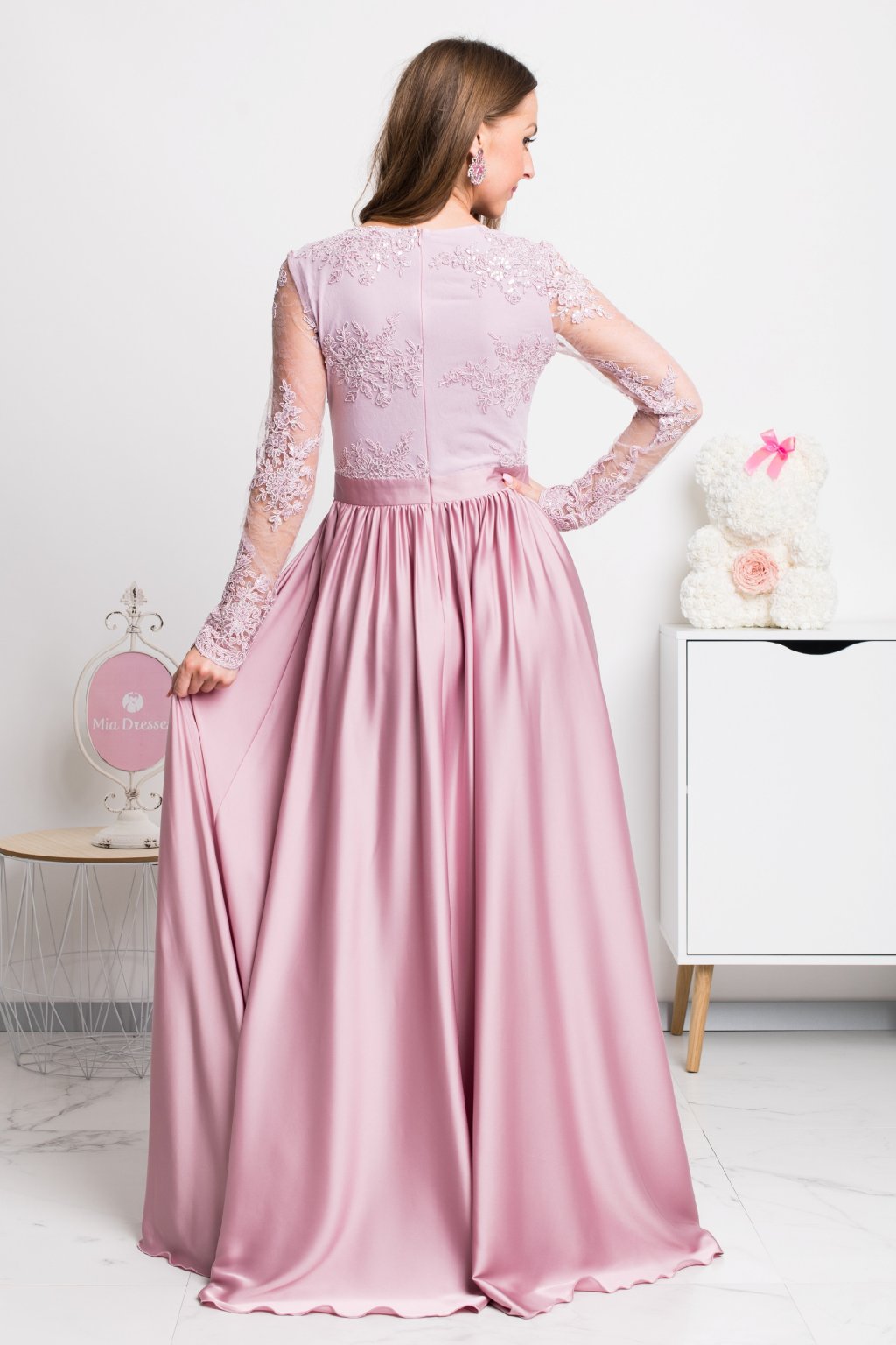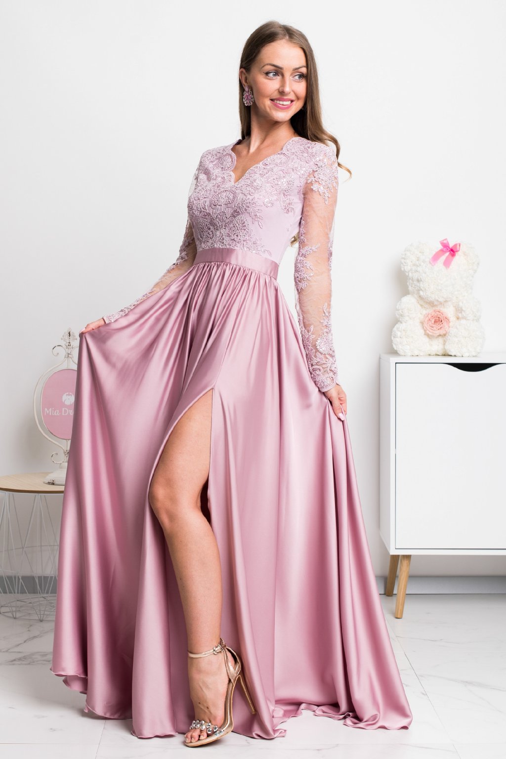 Poškodený tovar - Ružové spoločenské šaty s krajkou a saténovou sukňou