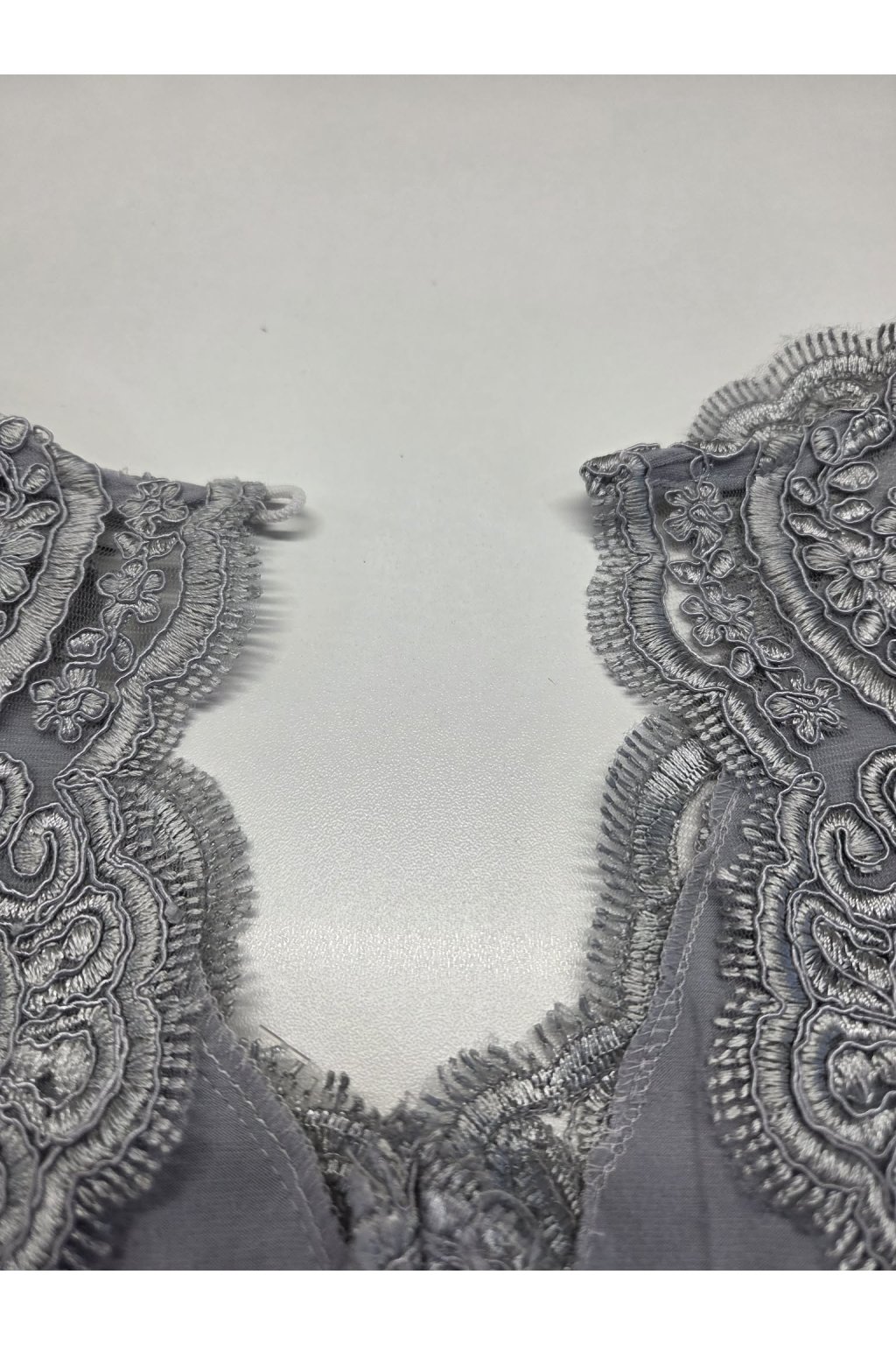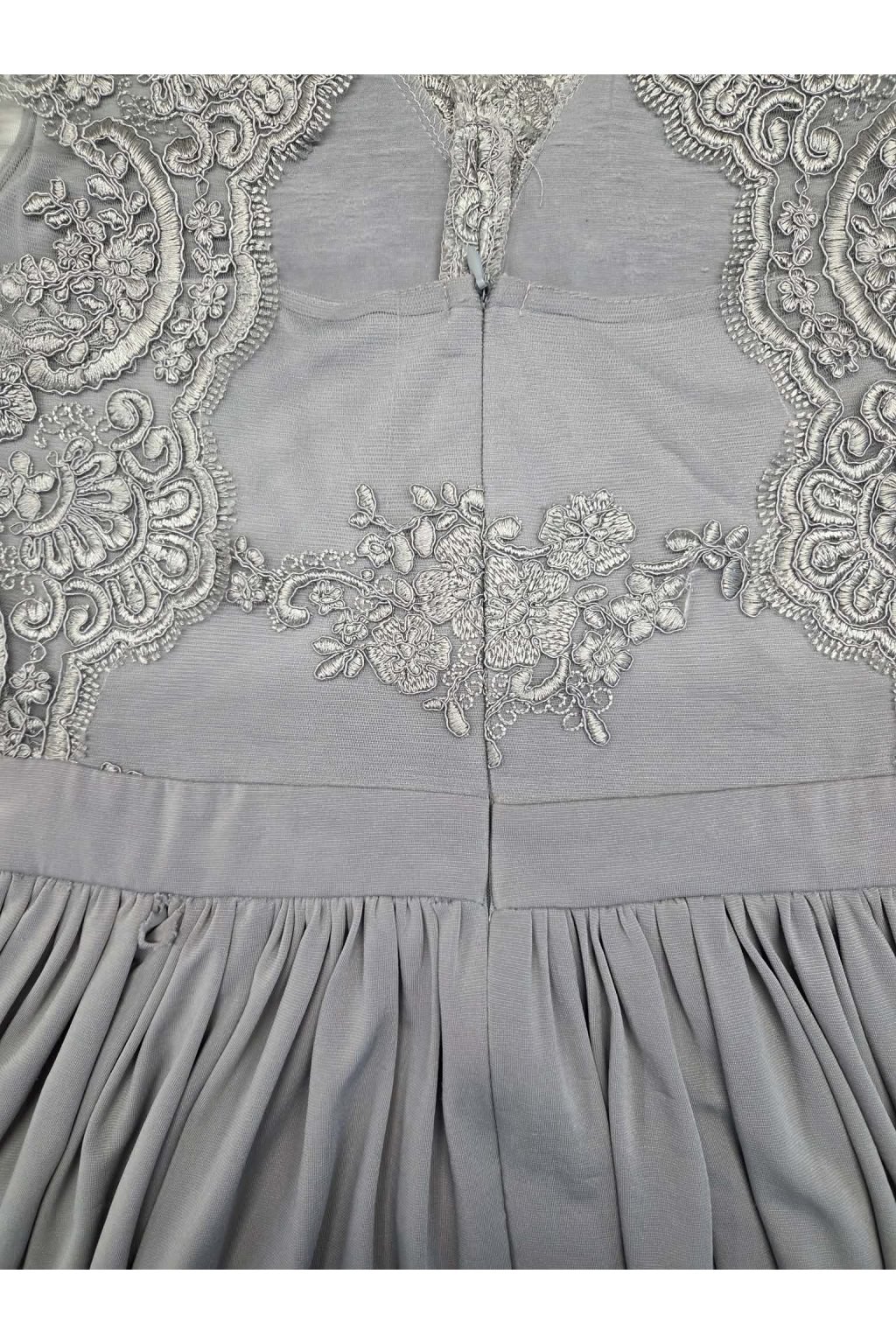 Poškodený tovar - Sivé spoločenské šaty s krajkou a výrezom na chrbte