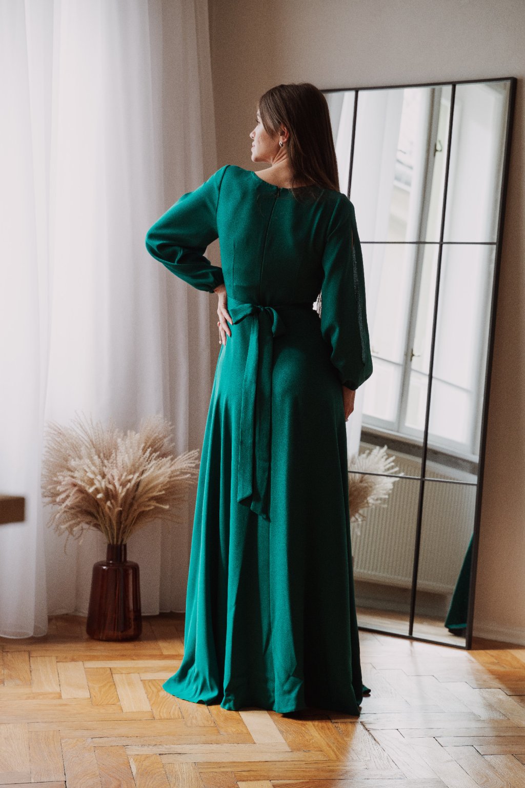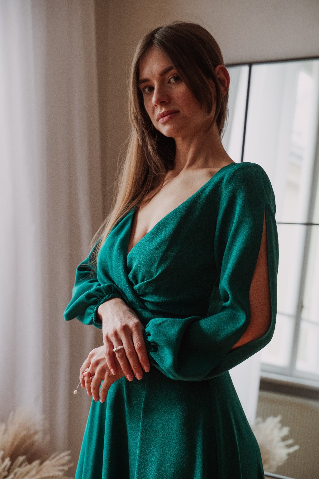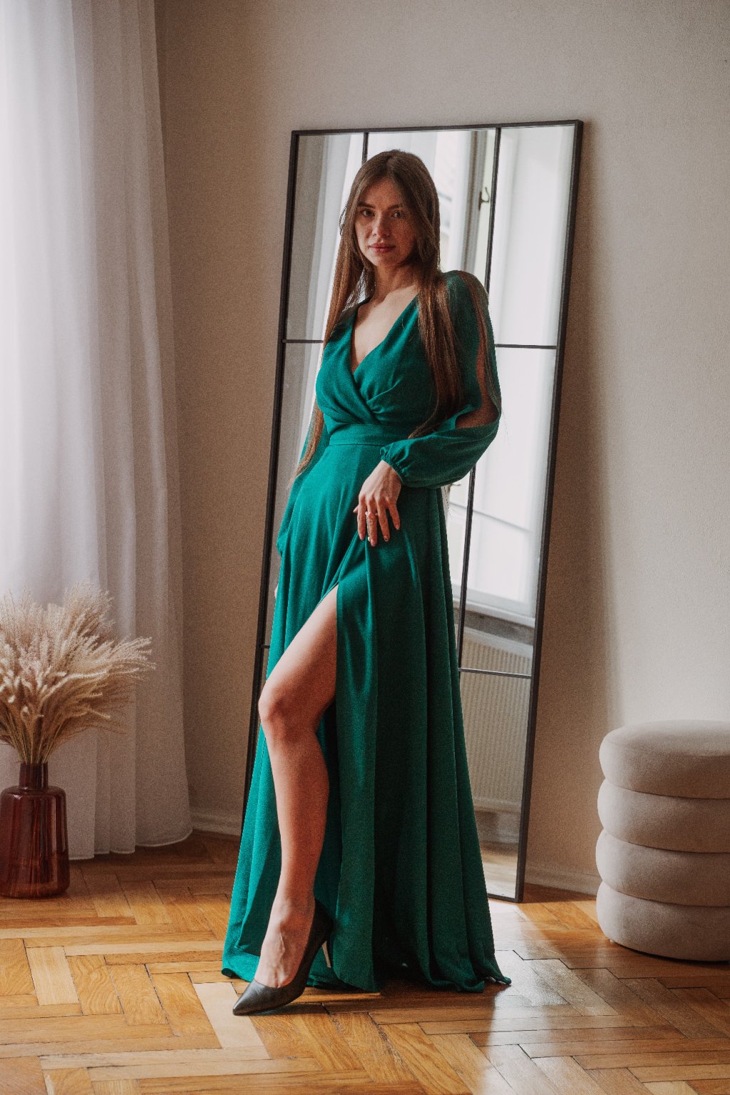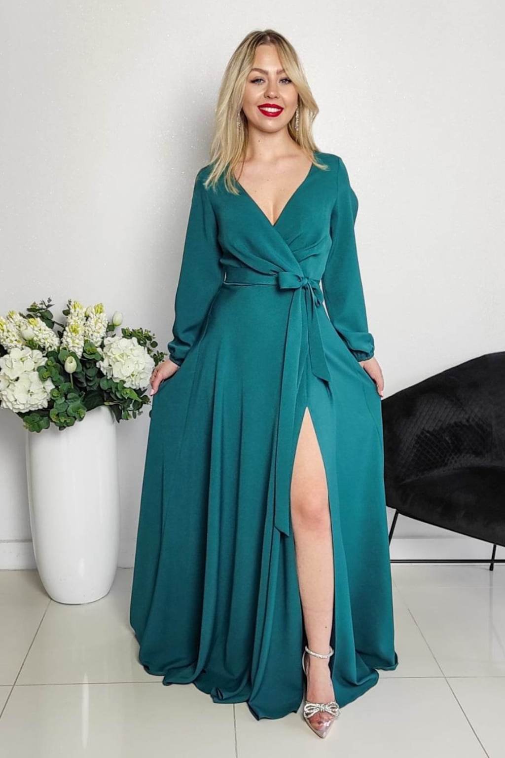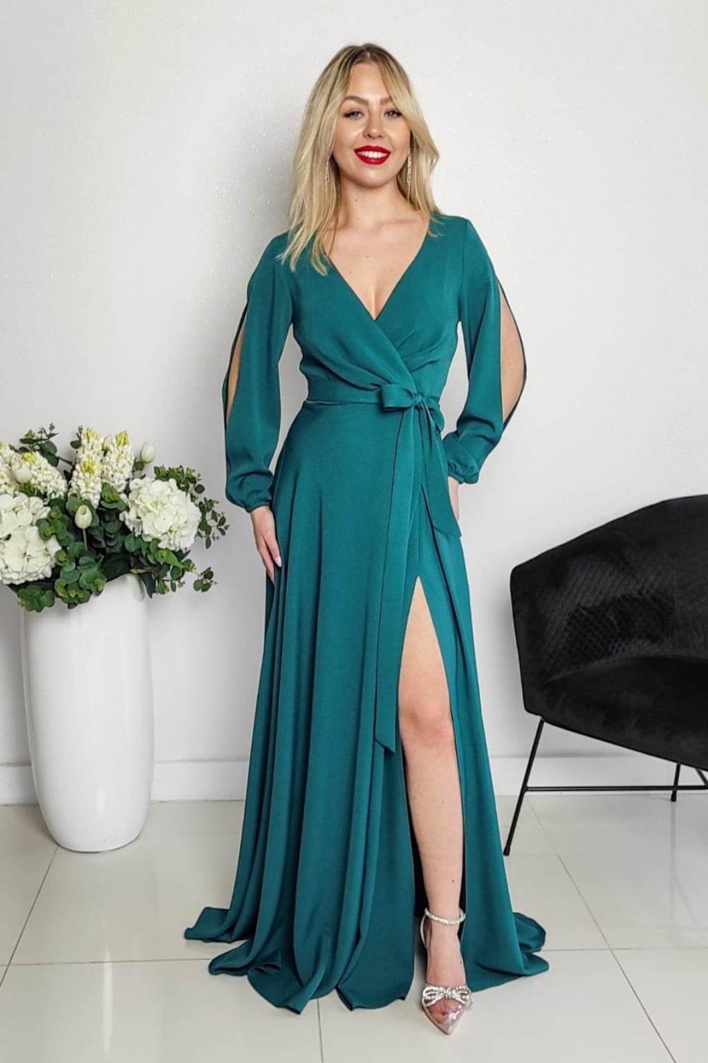 Poškodený tovar - Smaragdové spoločenské šaty s rukávmi a rozparkom
