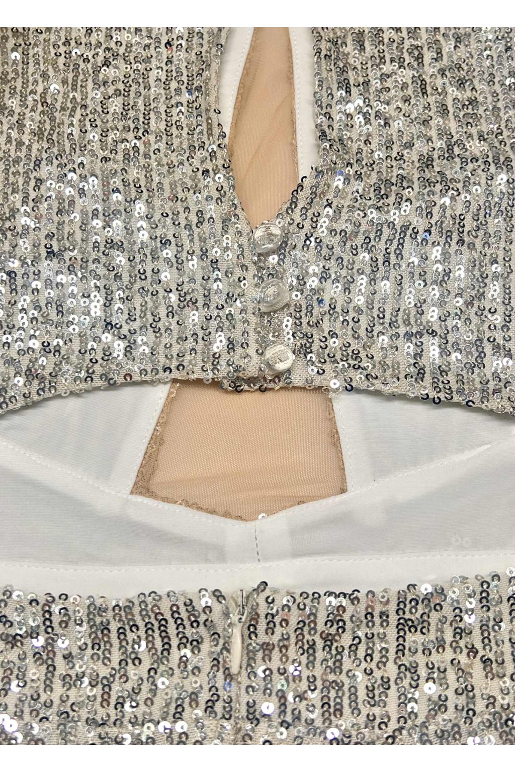 Poškodený tovar - Smotanové flitrované šaty s rozparkom