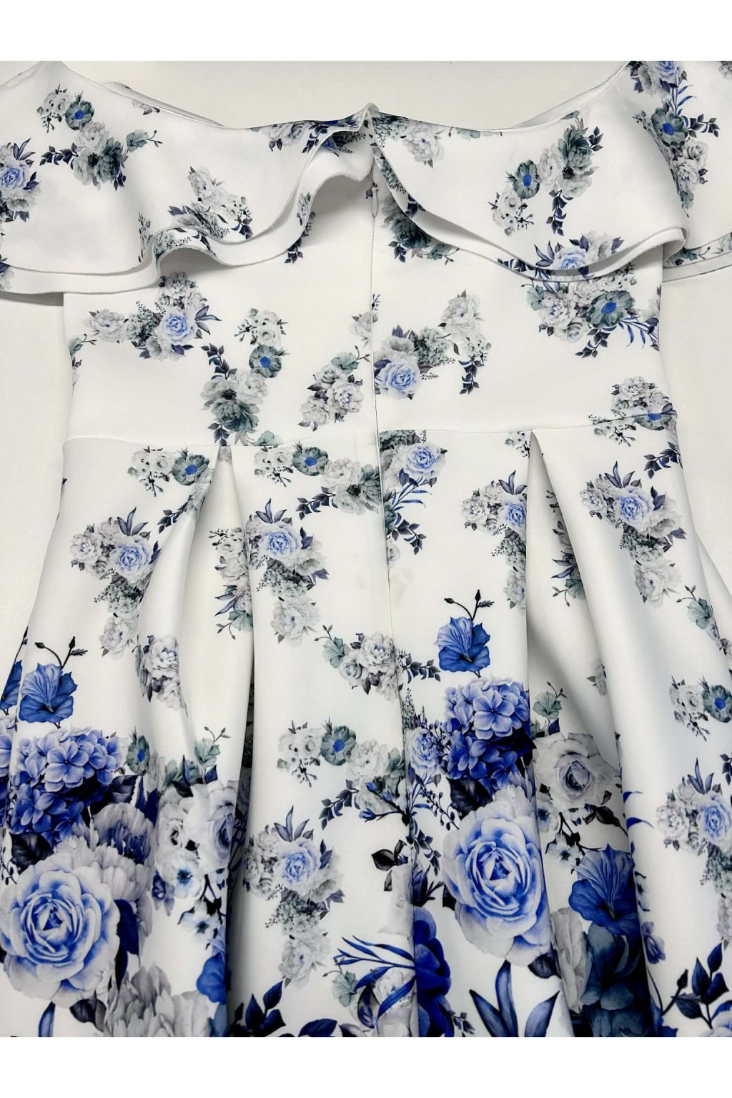 Tieto šaty sú jednoducho dokonalé! Rafinovane odhalené ramená lemované krásnym volánom, romantické kvetiny a nadýchaná sukňa - na kamarátkinej svadbe zaručene zažiarite. Materiál je mierne elastický a vzadu sa šaty zapínajú zipsom.
