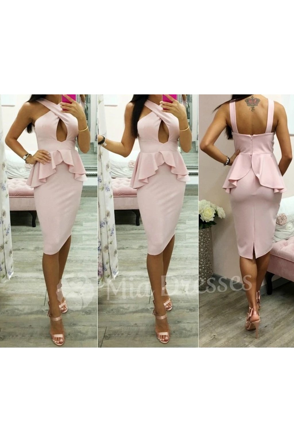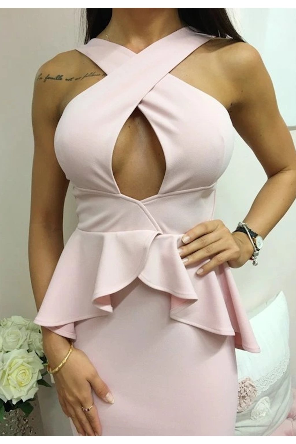 Sexi midi šaty v lichotivej pastelovej farbe ozdobené peplumom a odvážnejším výstrihom z vás urobia hviezdu. Šaty sú priliehavé vďaka elastickému materiálu a podčiarknu vaše ženské krivky. vzadu sa zapínajú zipsom.