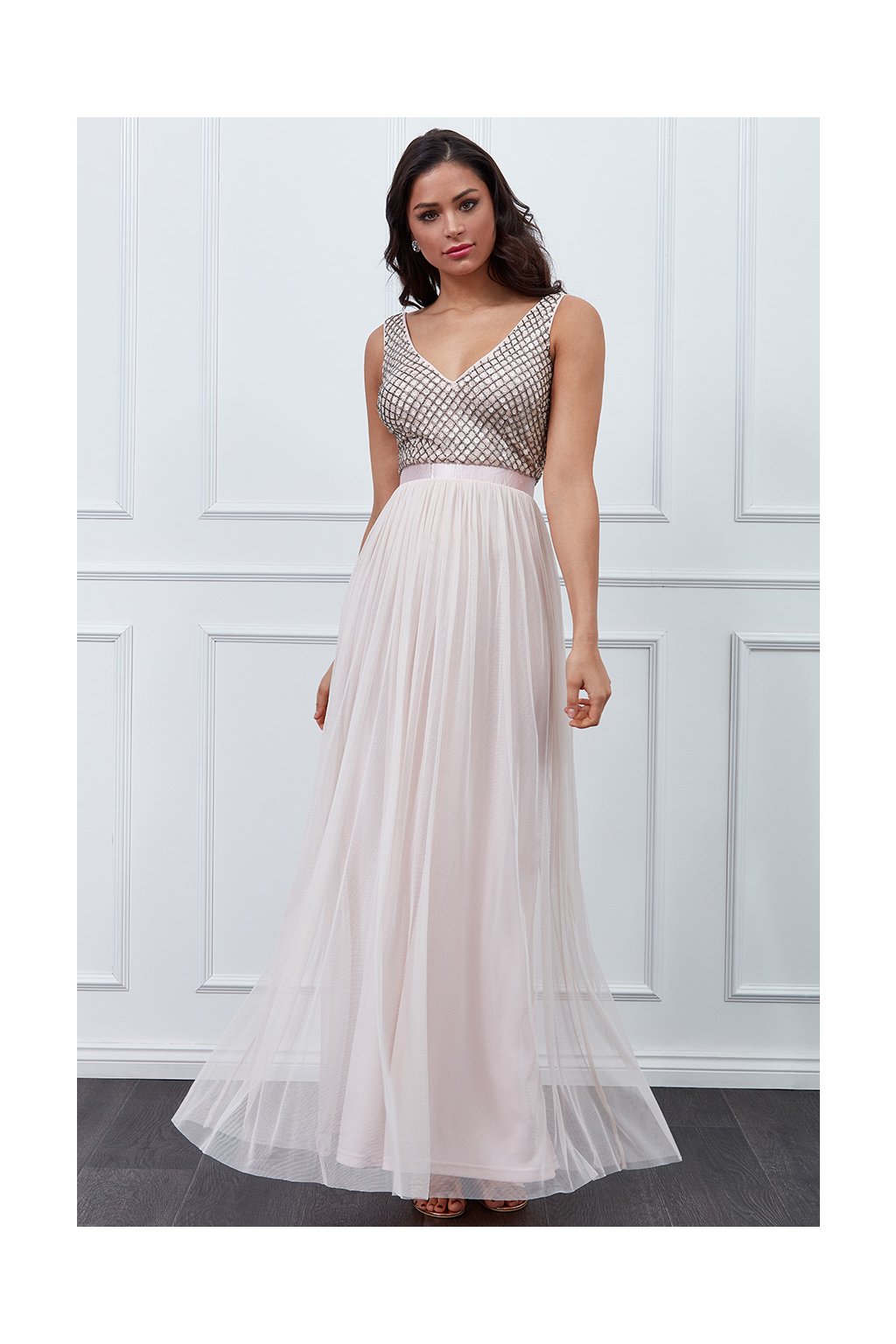 Stať sa aspoň na jednu noc princeznou? V týchto šatách nepochybne! Krásna tylová suknička a decentné zdobenie korálikmi vzbudzujú rozprávkový, romantický dojem. Vzadu sa zapínajú zipsom a vrchná časť šiat je mierne elastická.