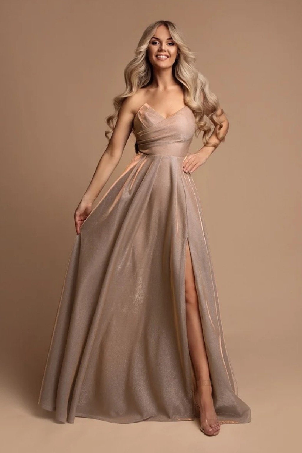Nadýchaná sukňa a krásny trblietavý materiál, to je jednoducho noblesná kombinácia, v ktorej na spoločenskej udalosti zaiste zažiarite. Šaty sú na prsiach vystužené, na sukni sa zapínajú zipsom a súčasťou šiat sú odnímateľné ramienka.