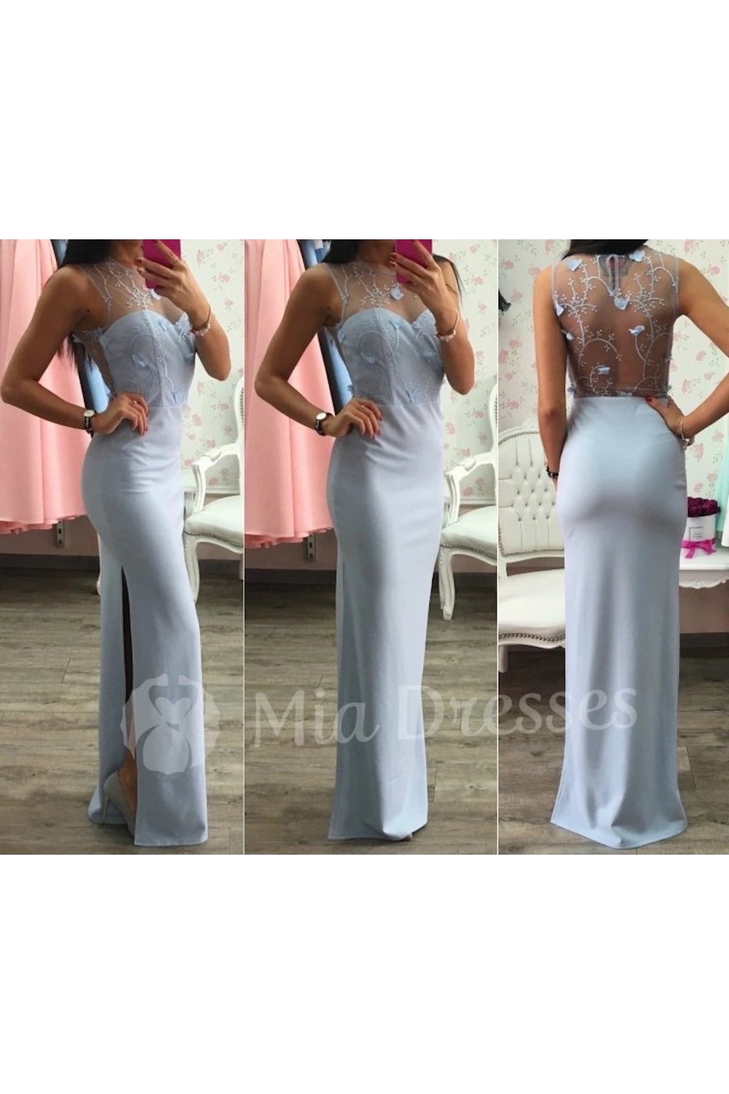 Dlhé spoločenské šaty v svetlomodrej farbe sú z elastického materiálu. Na vrchnej časti je našitý tyl, ktorý je zdobený výšivkami a romantickými srdiečkami. Na sukničke je zvodný rozparok. Šaty sa zapínajú zipsom na ľavej strane.