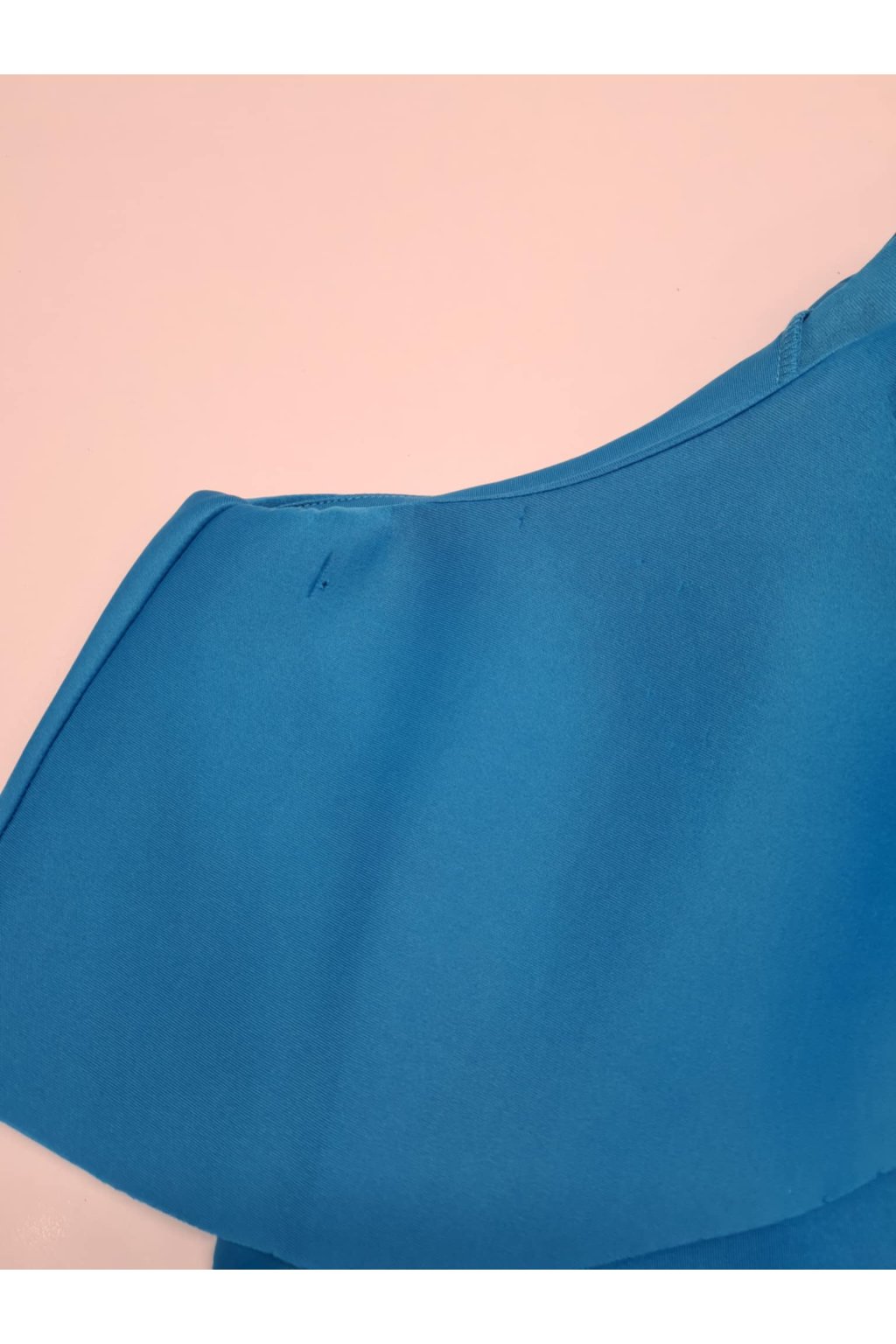 Elegantné midi šaty vo výraznej tyrkysovej farbe majú dekolt lemovaný mohutným volánom, ktorý si krásne drží nadýchaný tvar. Priliehavý strih šiat podčiarkne ženské krivky a vkusne odhalené rameno sa postará o príťažlivý vzhľad. Materiál je elastický.