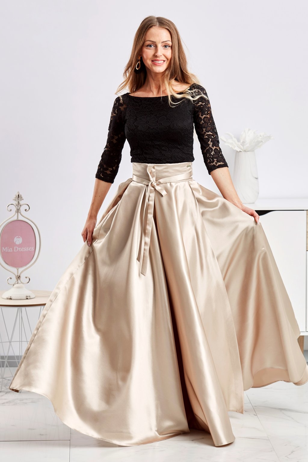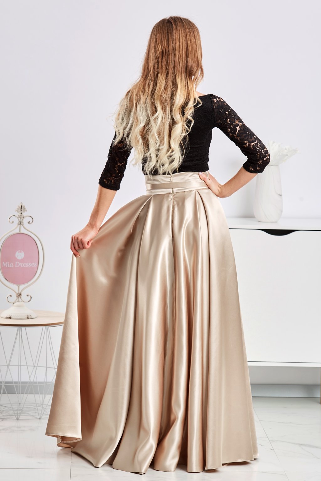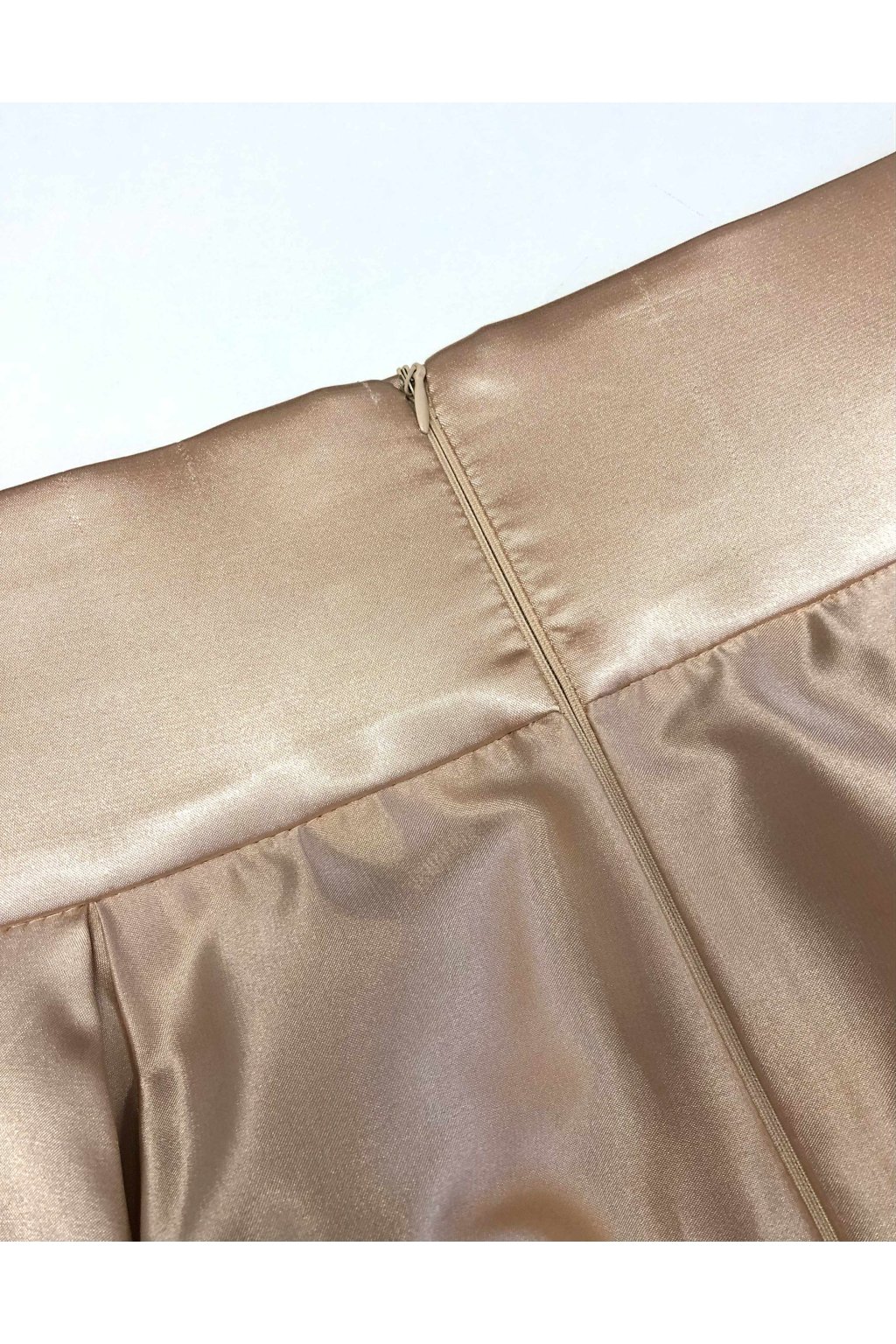 Luxusný outfit a pocit jedinečnosti vám zaručí táto zlatá sukňa. Tenký ľahučký satén vás pohladí na koži (aj na duši, keď sa uvidíte v sukničke v zrkadle). Stuha v páse, rozparok a vrecká sú už len sladkou bodkou na záver.