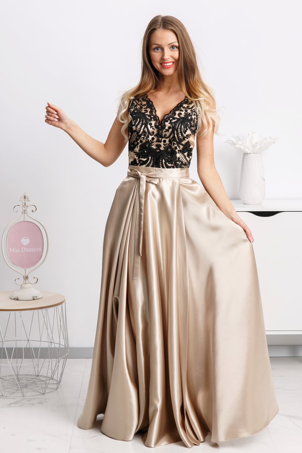 Spoločenské šaty, ktoré z vás urobia doslova kráľovnú noci! Čierno-zlatá farebná kombinácia pôsobí luxusne, jedinečne. Vrchná časť šiat je tylová, vyšívaná krásnym motívom a vpredu podšitá nepriehľadnou látkou. Sukňa je naopak saténová, s okúzľujúcim rozparkom a dodáva šatám luxusný šmrnc. Zapnete ich vzadu zipsom.