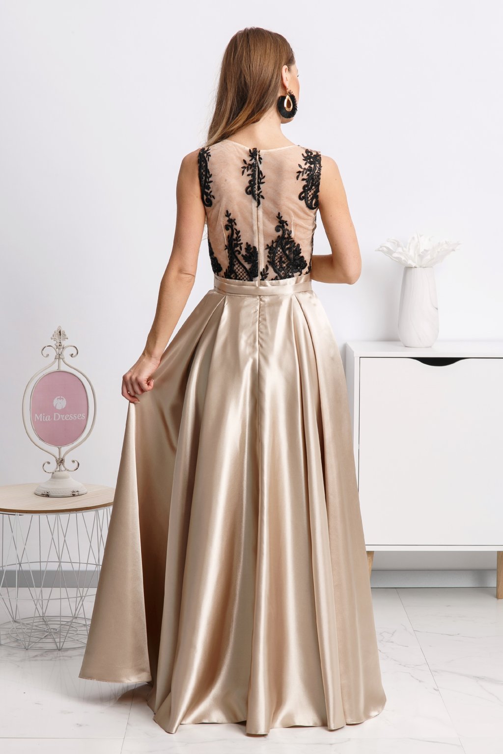 Spoločenské šaty, ktoré z vás urobia doslova kráľovnú noci! Čierno-zlatá farebná kombinácia pôsobí luxusne, jedinečne. Vrchná časť šiat je tylová, vyšívaná krásnym motívom a vpredu podšitá nepriehľadnou látkou. Sukňa je naopak saténová, s okúzľujúcim rozparkom a dodáva šatám luxusný šmrnc. Zapnete ich vzadu zipsom.