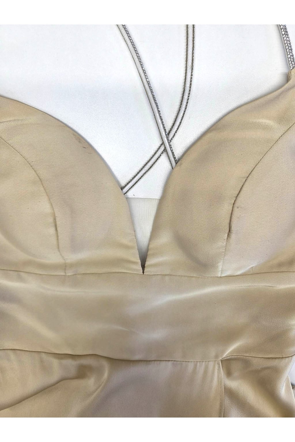 Tieto magické spoločenské šaty z vás vykúzlia šarmantnú dámu s veľkou dávkou elegancie a noblesy. Pútavými ich robia ramienka posiate drobnými lesklými kamienkami. Na prsiach sú šaty vystužené a vzadu sa zapínajú zipsom.