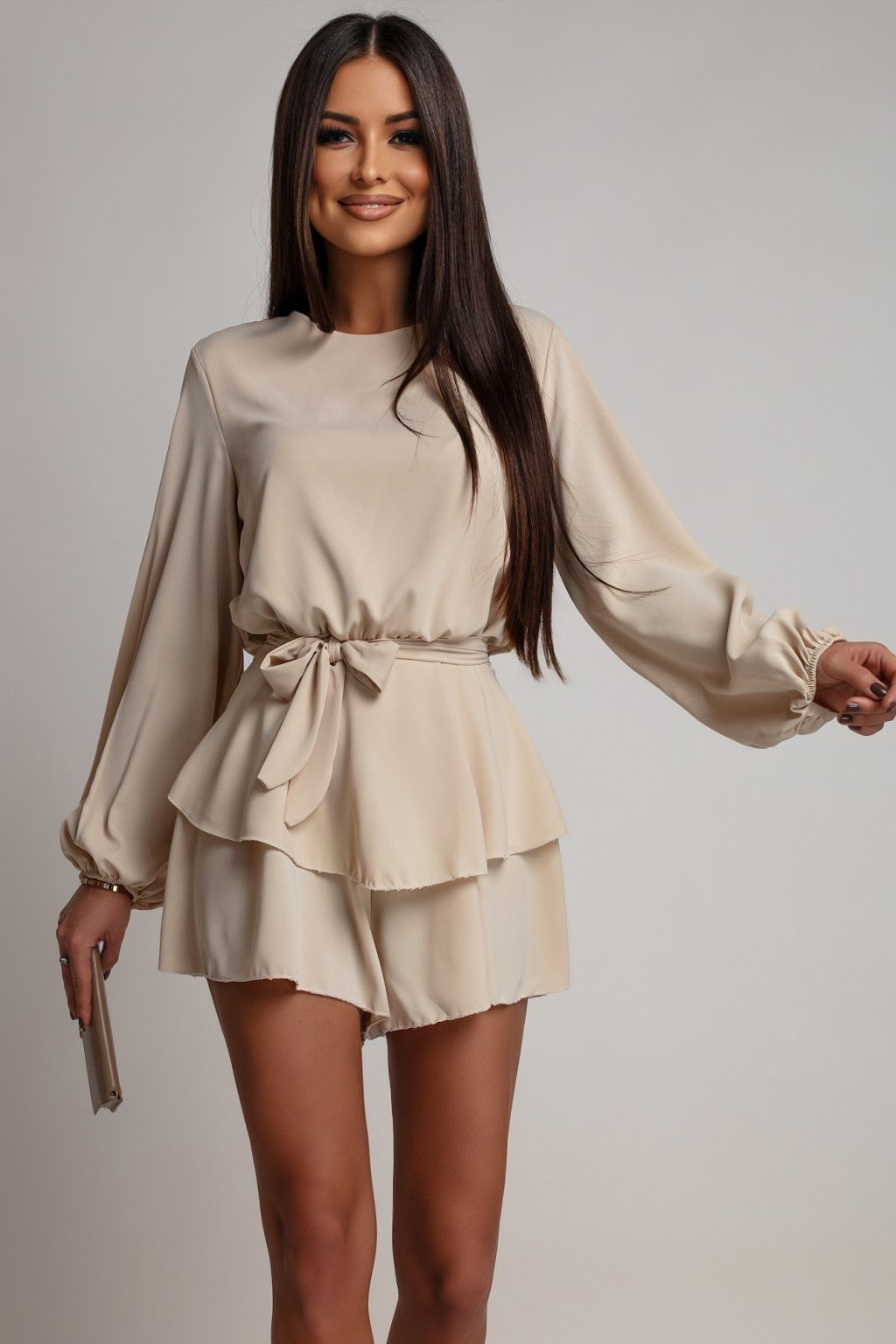 Tento overal je stelesnením sebavedomej elegancie a nenúteného pôvabu. Pôsobí luxusne, no zároveň ľahko a žensky – presne tak, aby podčiarkol prirodzenú krásu bez zbytočnej okázalosti. V kombinácii s výraznými doplnkami alebo minimalistickým stylingom vytvára dokonalý glamour look, ktorý je zvodný, sofistikovaný a nezabudnuteľný.