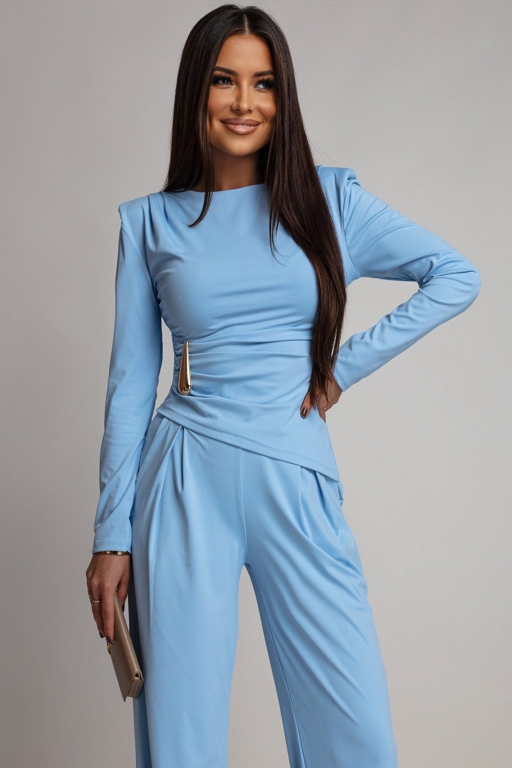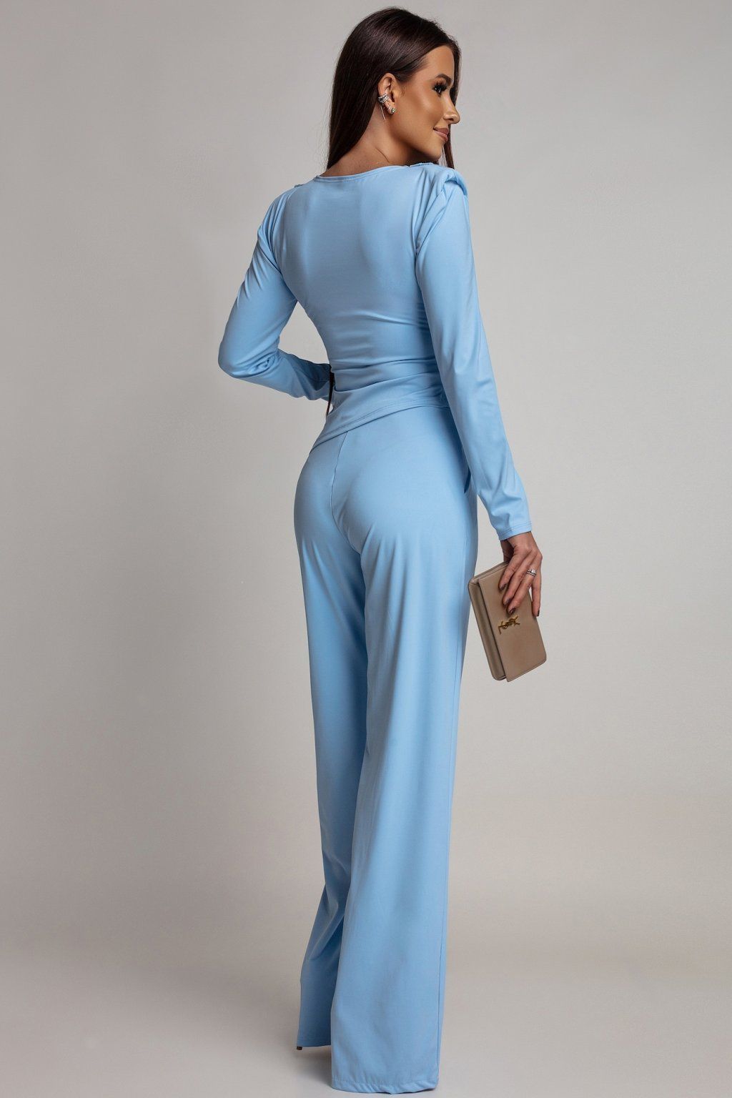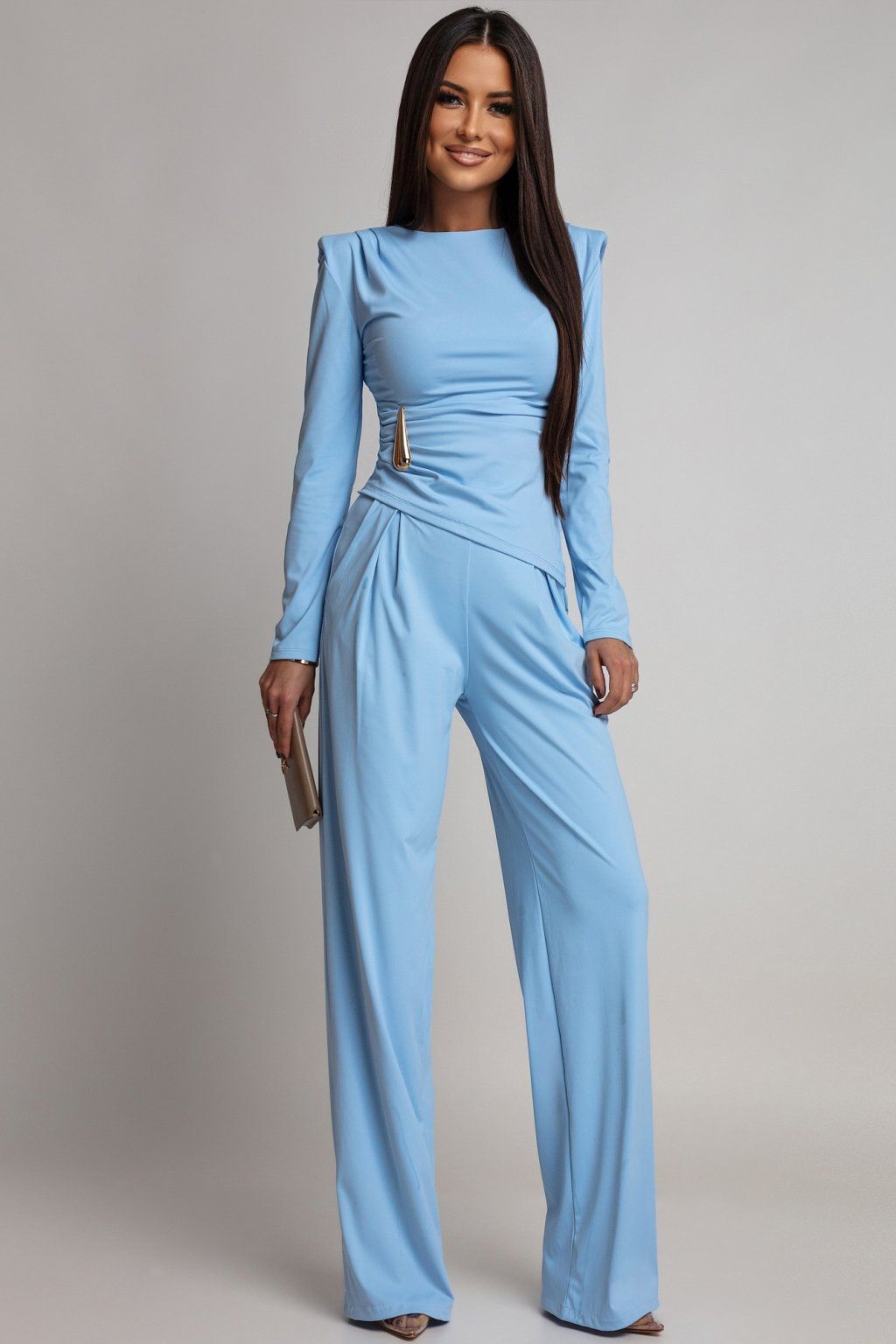 Štýlový komplet zložený z topu a dlhých voľných nohavíc, ktorý spája eleganciu so zmyselnosťou. Zaujímavý a nadčasový kúsok do šatníka, v ktorom budete pôsobiť sebavedomo a žensky – či už v práci, na oslave alebo spoločenskom stretnutí. Materiál kompletu je elastický.