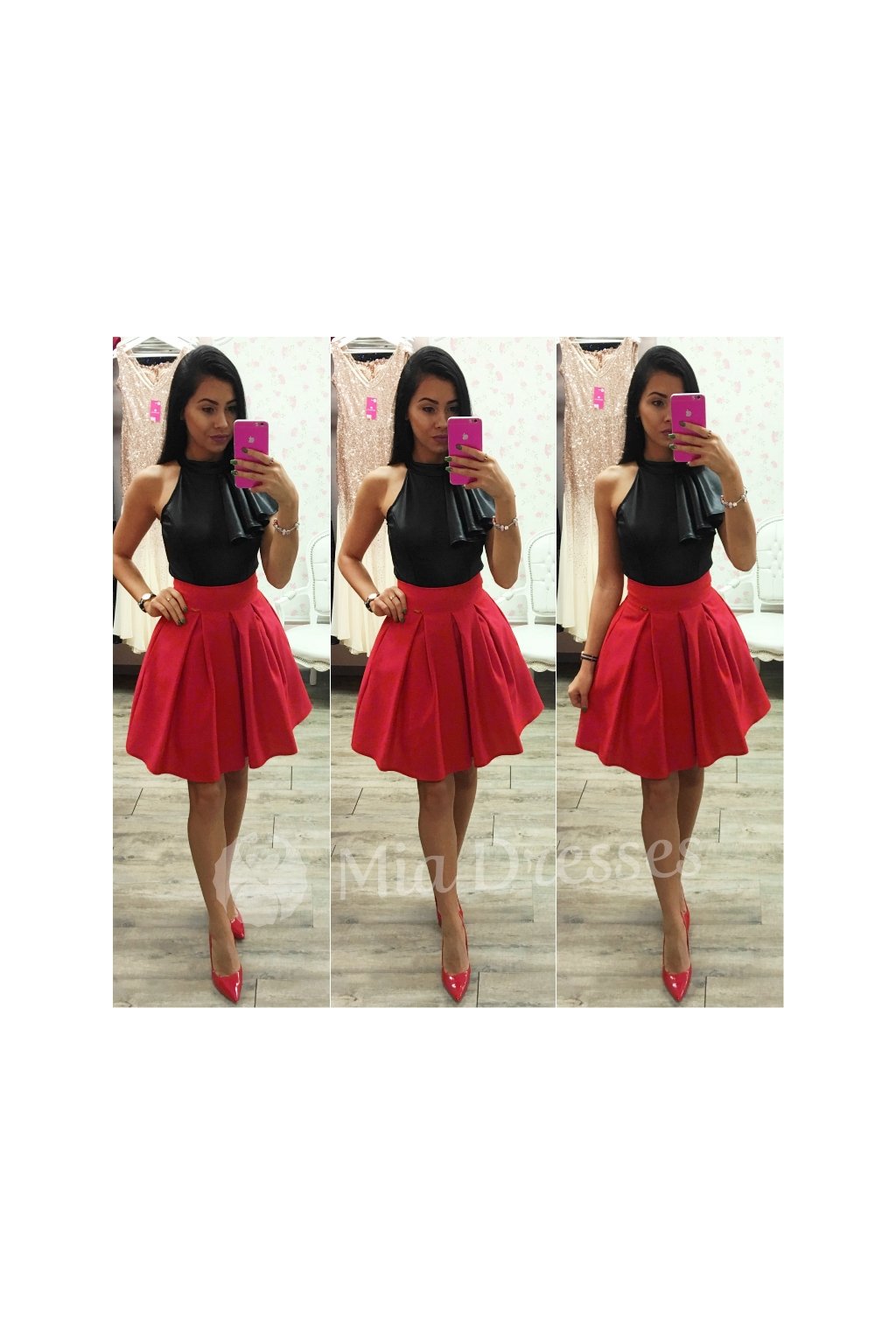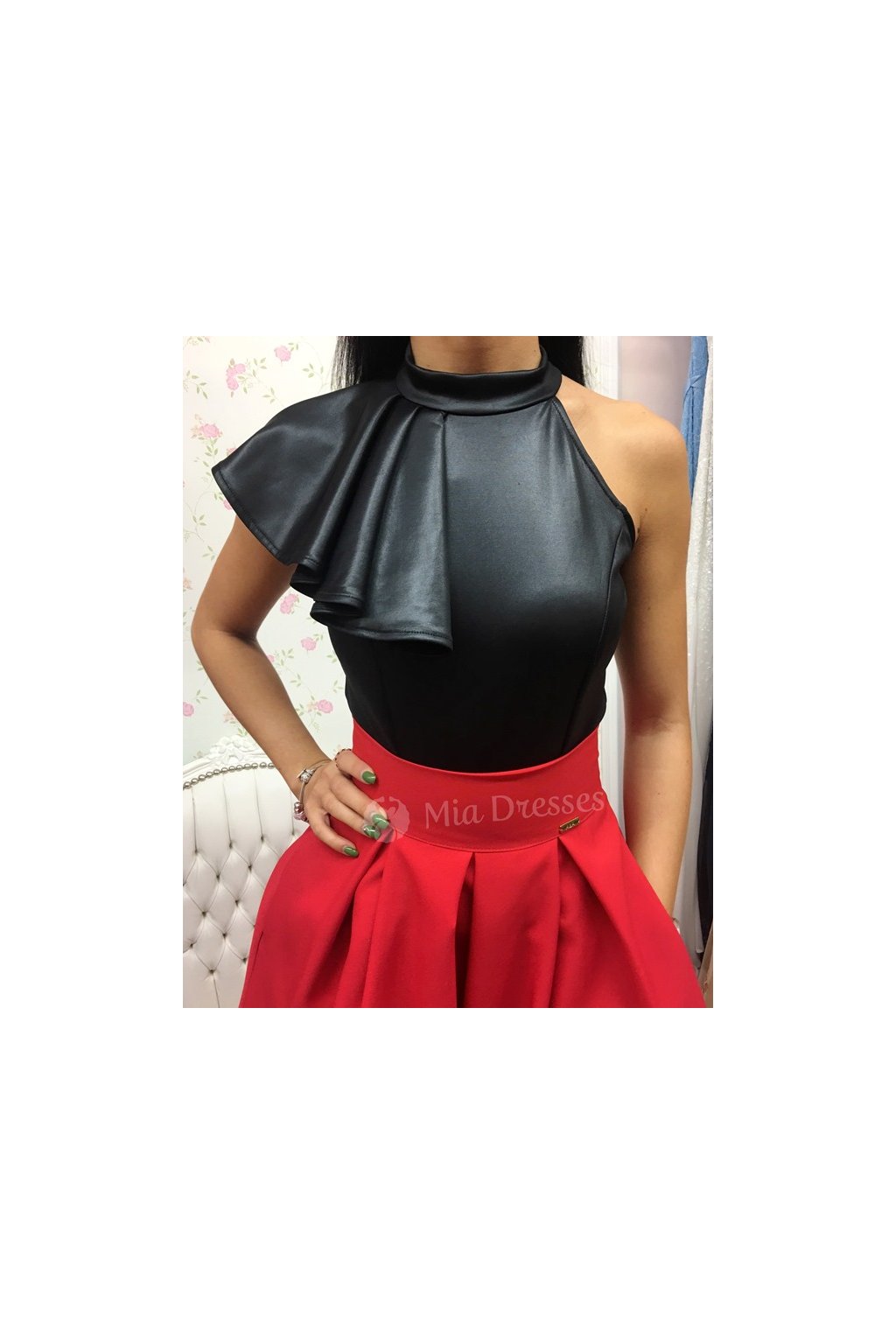 Body bez rukávov, z jemne lesklého materiálu, je bez výstrihu. Dominantným prvkom tohto kúsku je výrazný volán cez pravé rameno. Vzadu má zapínanie na zips až ku krku.