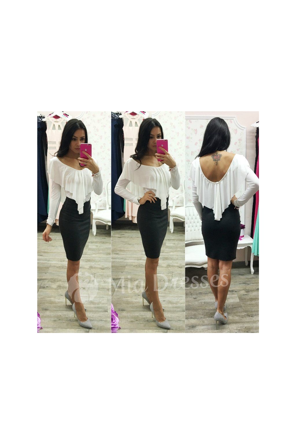 Jednofarebný top z jemného elastického materiálu je doplnený volánom. Zaujímavý strih, ktorý nám mierne odhaľuje chrbát, určite upúta zrak nejedného milovníka nevšedných strihov. Top vieme kombinovať s jednoduchou sukňou, ale aj džínsami, a tak dostaneme krásny outfit.